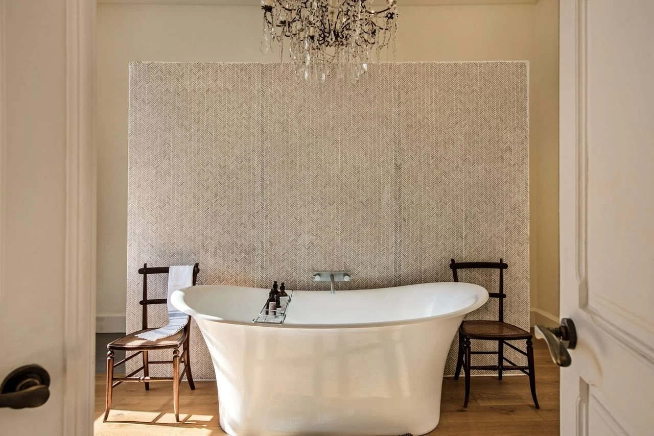 The only room with both a full bathtub and shower, plus two Juliette balconies.